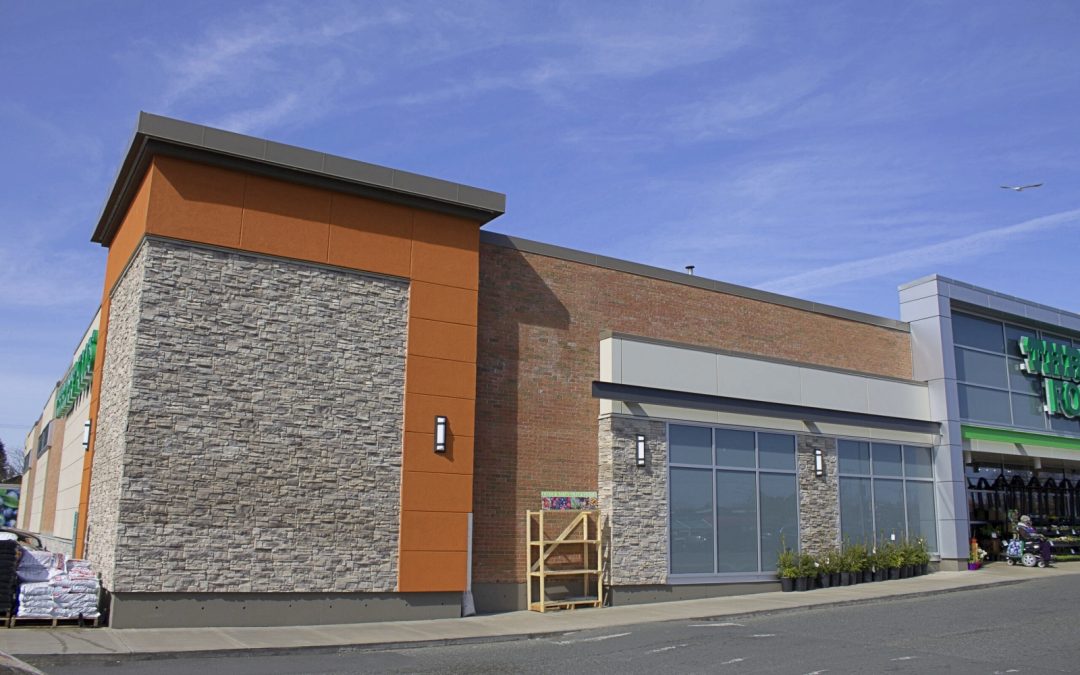 This commercial masonry project features high-quality manufactured stone veneer applied to a modern retail building. The combination of stone, brick, and architectural panels enhances curb appeal while ensuring durability and low maintenance. Our team specializes in commercial stonework for retail, office, and industrial buildings across Victoria, BC.